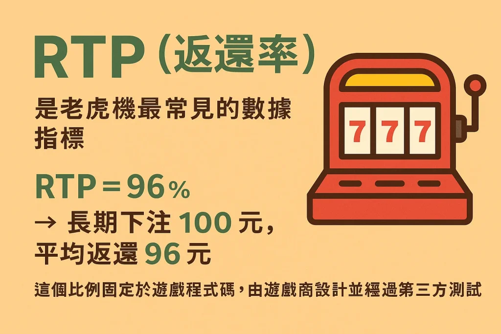 RTP(Return to Player) 是老虎機最常見的數據指標。它代表遊戲在「長期運行」下返還給玩家的平均比例。